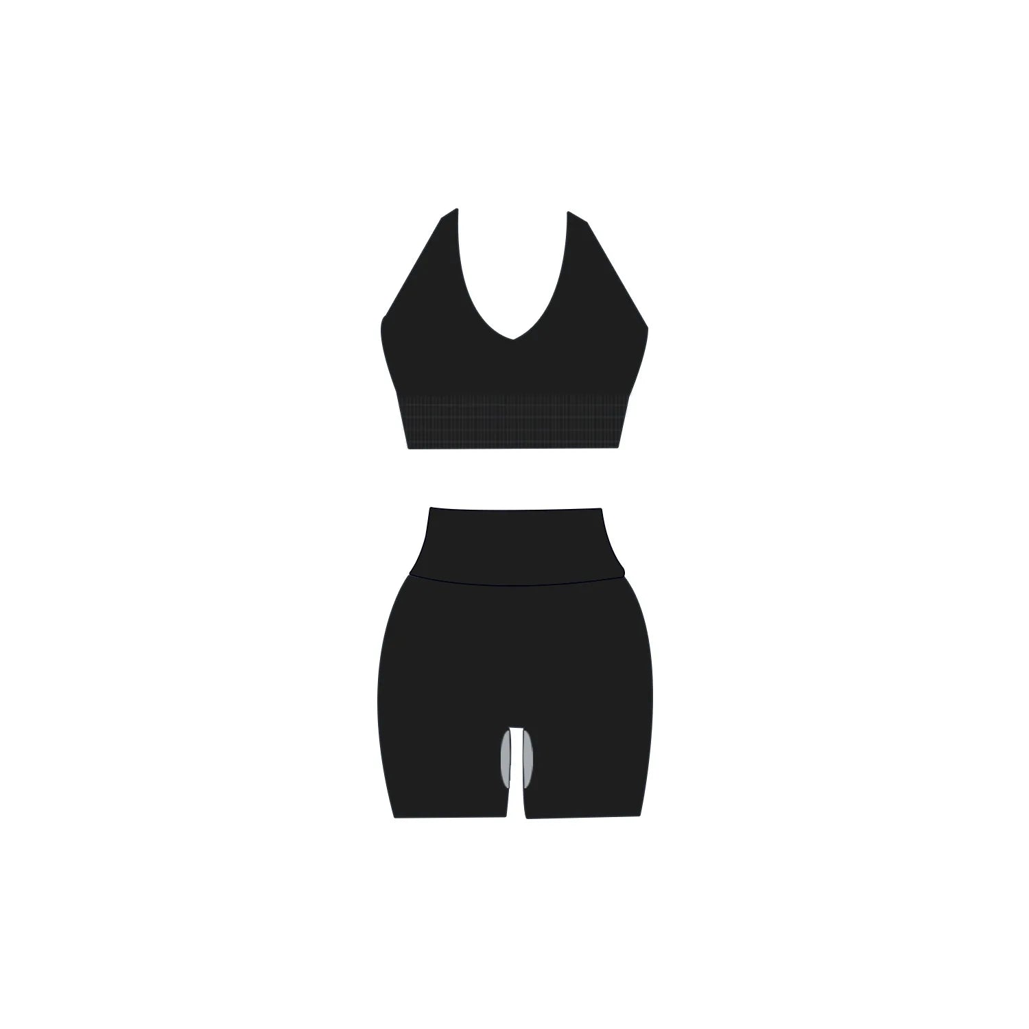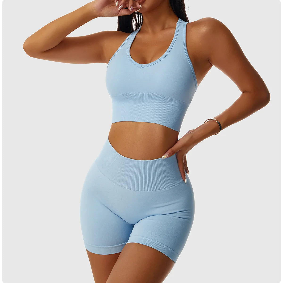 Deze stijlvolle yoga set combineert functionaliteit met een moderne uitstraling, perfect voor jouw sportschool sessies en yogalessen. De set bestaat uit een sexy bandjes-BH met zachte korte mouwen en hoge taille shorts die je billen subtiel liften voor een flatterende pasvorm.